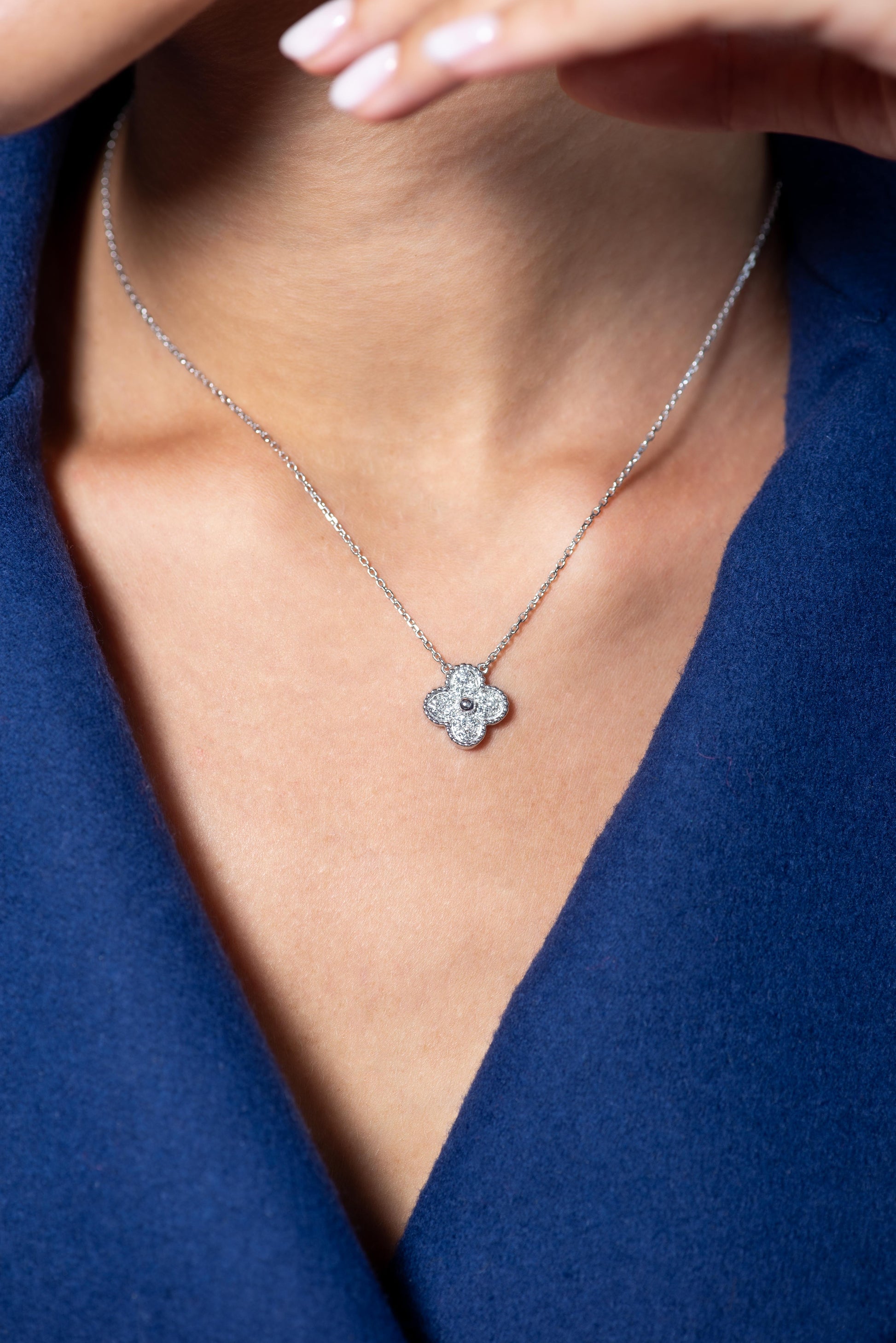 Zawieszka oraz kolczyki ozdobione są precyzyjnie osadzonymi cyrkoniami jubilerskimi, charakteryzującymi się wysoką przejrzystością i estetycznym połyskiem.